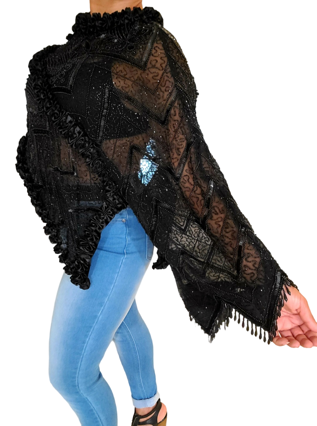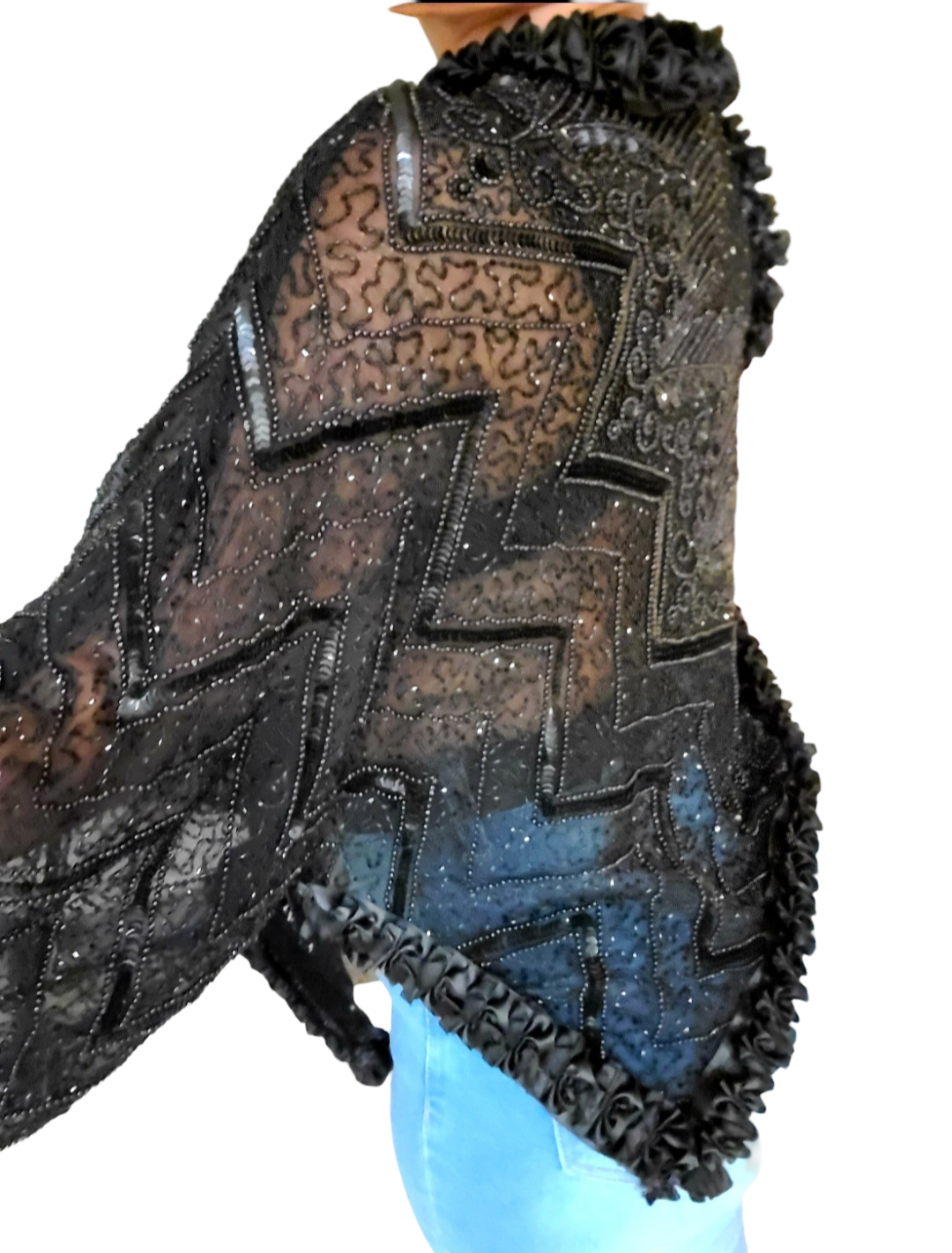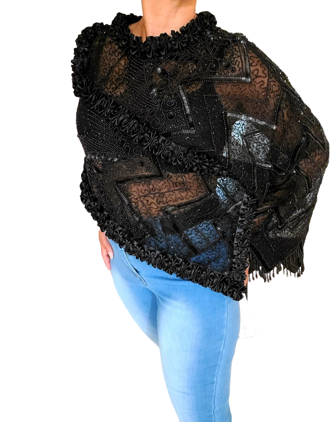 FloridaButterflyTop. Sooo spark the conversation by telling your friends you are a conscious consumer. This is sustainable fashion we make clothing great again. Now this unique design has all the bells so get ready to light up the room when you walk in. This is a magical decorative top, absolutely a show stopper. Crafted and re-vamp mesh fabric and beads details. Round neck, one arm with beautiful details.